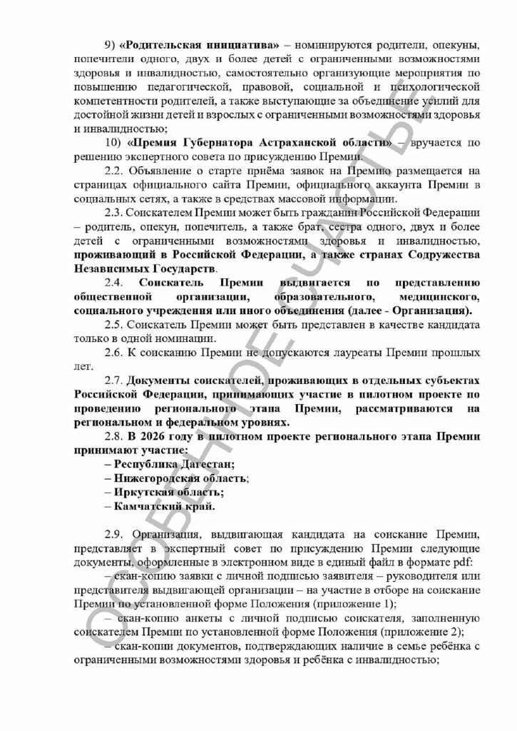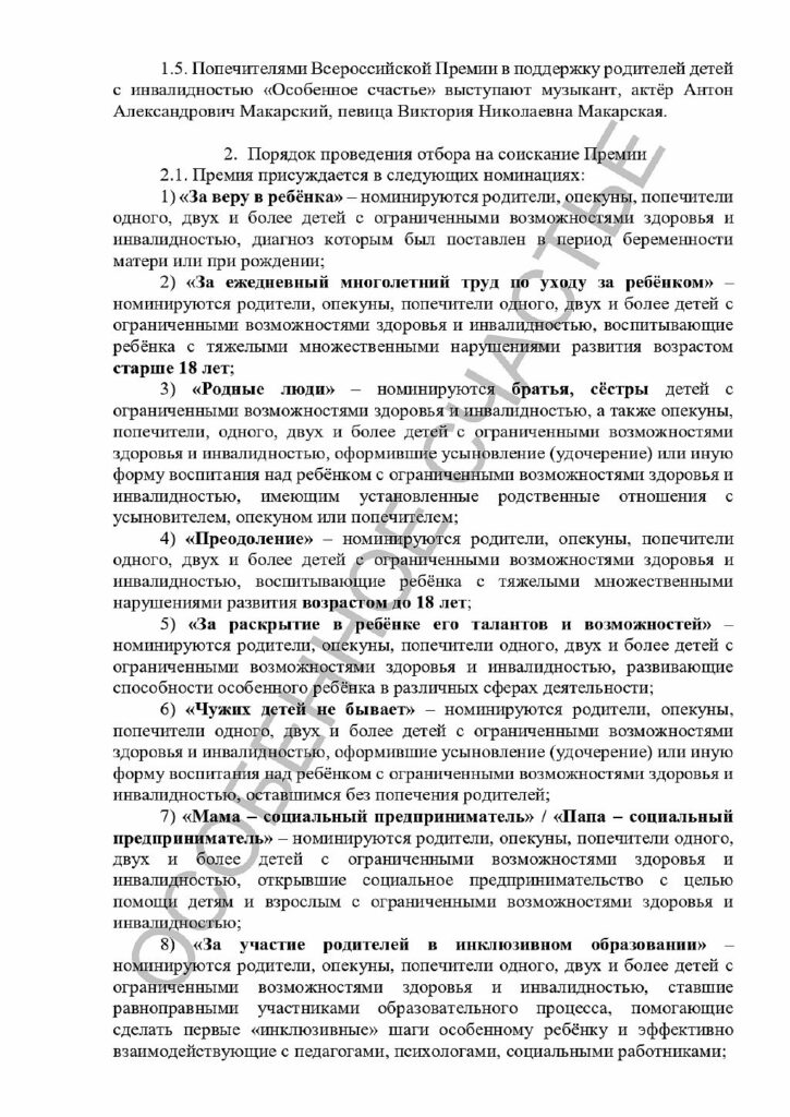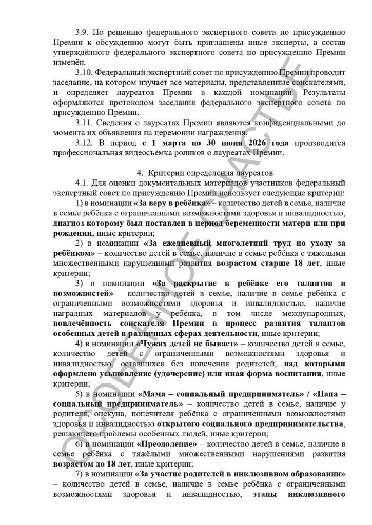 Полный список номинаций и подробные требования к оформлению документов указаны в Положении о Премии (прилагается). Определение лауреатов Премии проводится в четыре этапа. На первом этапе ( с 3 декабря 2025 года по 11 января 2026 года) осуществляется прием пакета документов в электронном виде на официальную почту Премии premiya_osobennoeschastye@mail.ru.