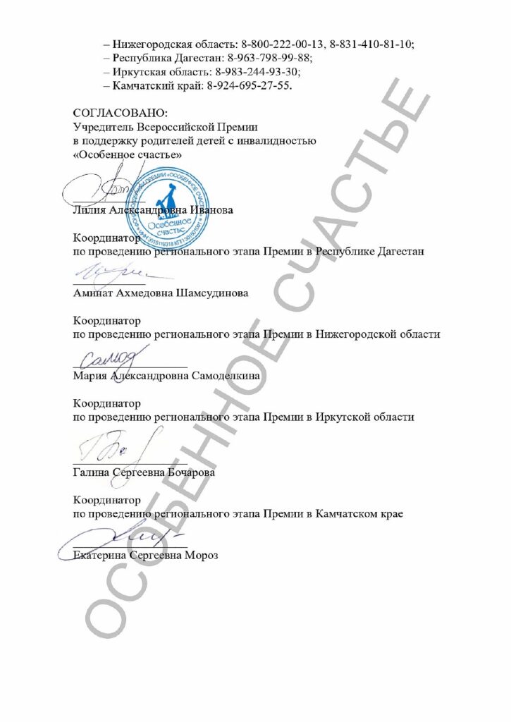 В случае возникновения дополнительных вопросов необходимо обратиться: Бочарова Галина Сергеевна- Координатор по проведению регионального этапа Премии в Иркутской области, тел: 89832449330. Белоусова Олеся Валерьевна-главный советник в аппарате Уполномоченного по правам ребенка в Иркутской области, тел: 8(3952)34-24- 27.