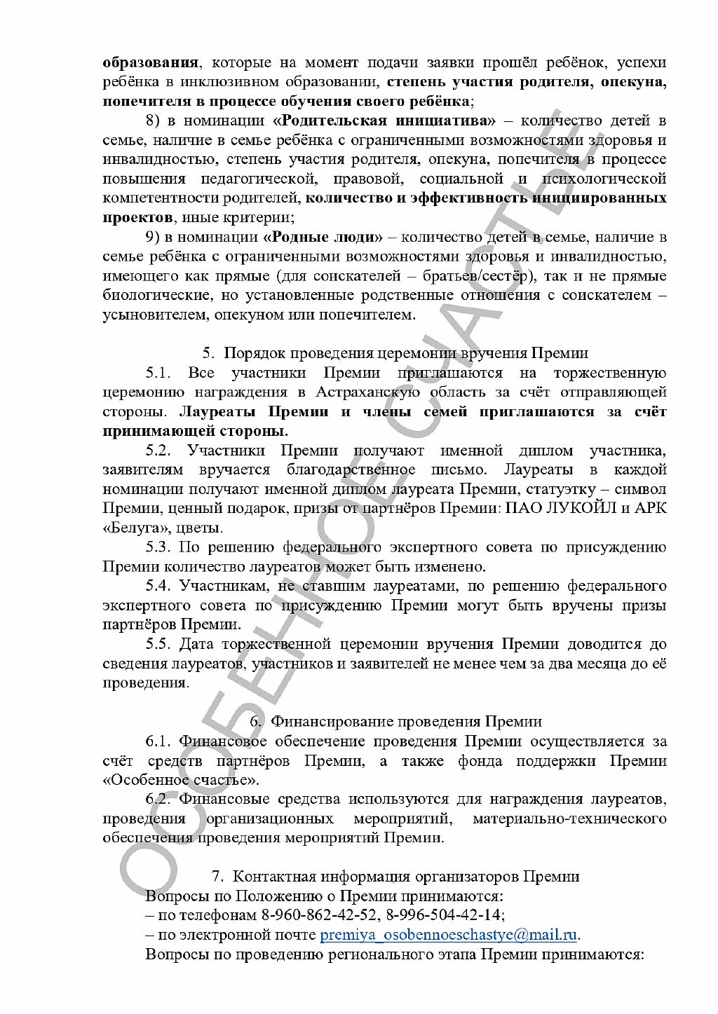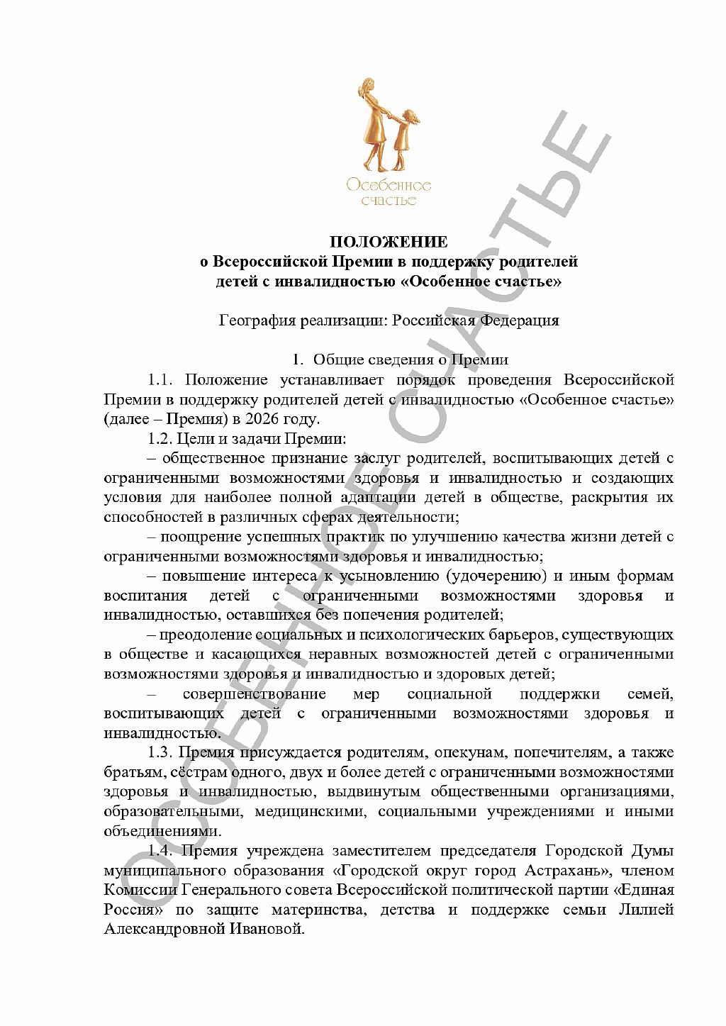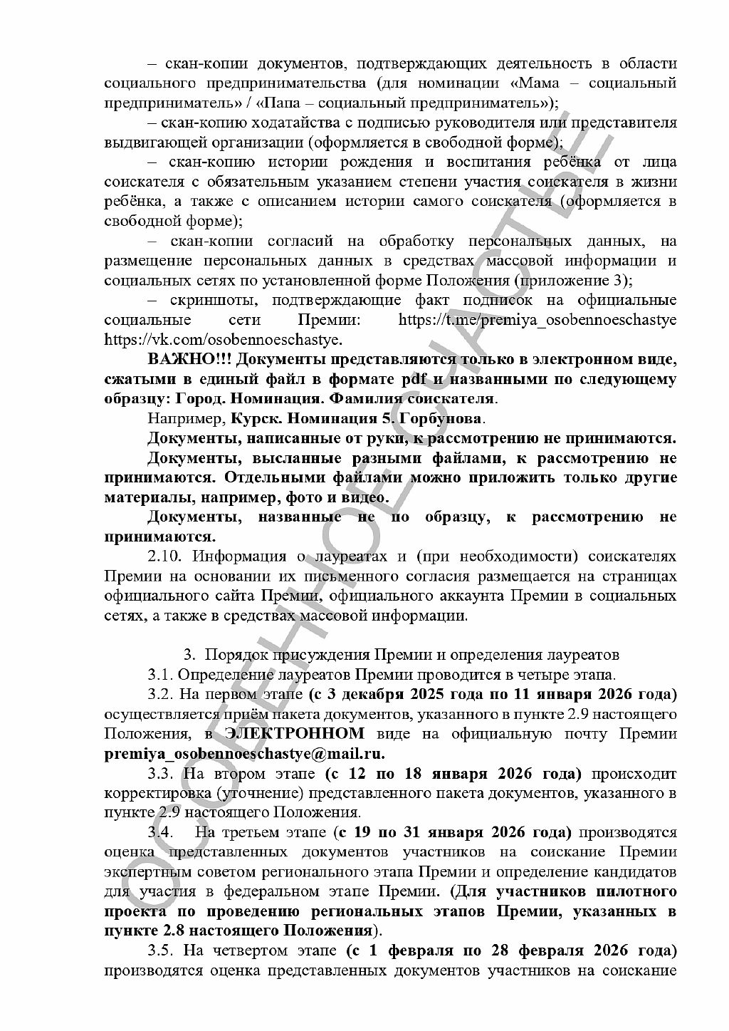 Полный список номинаций и подробные требования к оформлению документов указаны в Положении о Премии (прилагается). Определение лауреатов Премии проводится в четыре этапа. На первом этапе ( с 3 декабря 2025 года по 11 января 2026 года) осуществляется прием пакета документов в электронном виде на официальную почту Премии premiya_osobennoeschastye@mail.ru.
